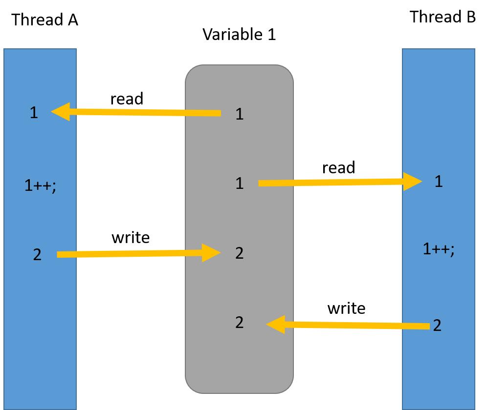 위 상황에서는 분명 변수 1을 두 개의 쓰레드가 각각 1씩 증가를 해주었기 때문에 최종적으로 3이 되어야 하지만 2가 되었습니다. 이러한 상태를 경쟁 상태라고 부릅니다.