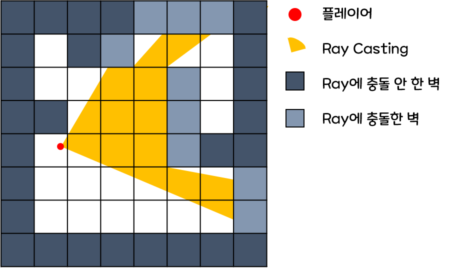 raycasting은 2D 혹은 3D에서 원근감을 구현하기 위한 방법 중의 하나 이다. 가상의 공간에 보이지 않는 빛(Ray)을 투사해 빛에 닿는 물체의 표면을 확인한다.