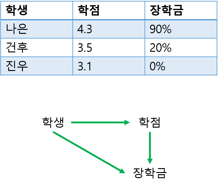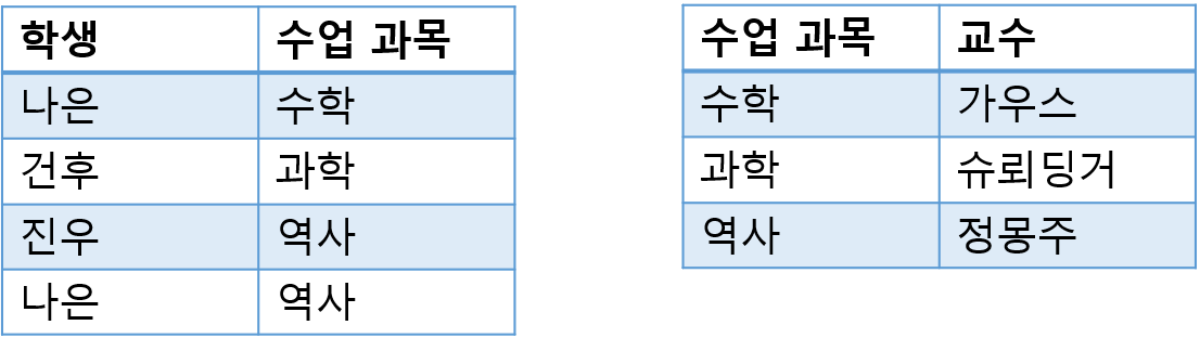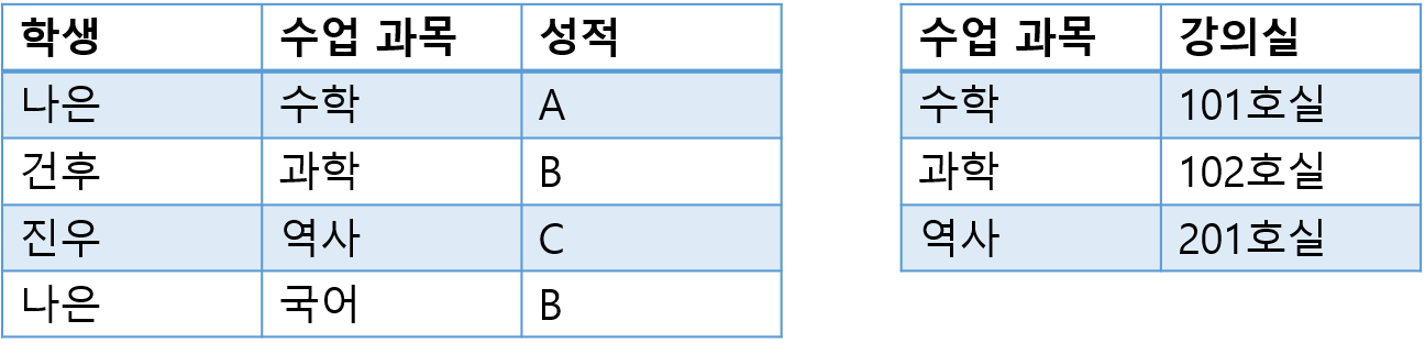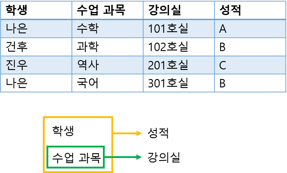 DB에서는 데이터의 키값 역할을 하는 PK(Primary Key)와 벨류 역할을 하는 일반 컬럼들이 있다. 헌데 아래의 테이블에서는 학생 & 수업과목 이 복합키 역할을 해서 이에 따라 성적의 값이 결정되지만, 강의실의 경우 학생과는 상관없이 수업과목에 의해서만 값이 결정된다. 이러한 상황에서 강의실 데이터를 다른 테이블로 빼주는 것을 제 2 정규화라고 한다.