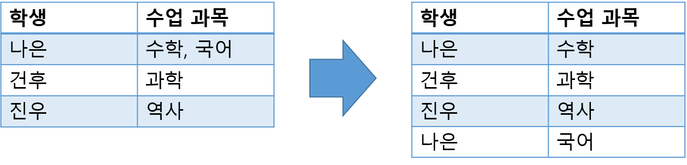 제 1정규화에서는 데이터들이 한컬럼에 하나 씩만 들어가도록 조정합니다. 하나의 컬럼에 두 개 이상의 데이터가 들어갈 경우 데이터를 조회하고 수정하는데 비효율적이기 때문입니다.