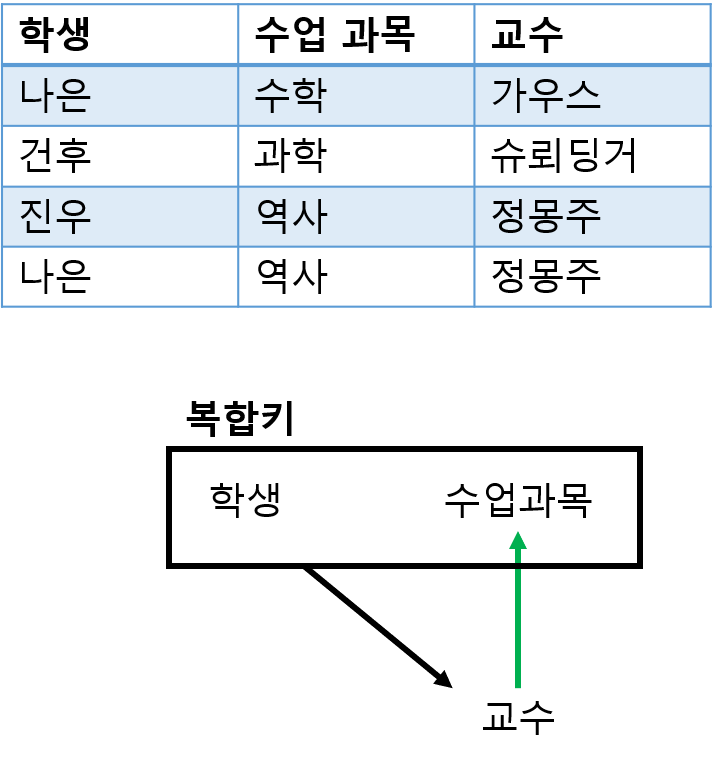 아래의 테이블 같은 경우 교수가 수업과목을 결정하는 결정자역할을 하지만 정작 테이블의 후보키에는 들어가지 않는다. 이로인해 생길 수 있는 문제들은 첫째로 교수의 수업이 추가되더라도 수강생이 생기기 전까지는 데이터를 추가할 수 가 없다. 그리고 두번째로는 한과목의 모든학생들이 수강을 취소할경우 교수->수업과목 데이터도 함계 삭제된다. 마지막으로는 교수가 수업과목을 변경할경우 모든학생의 수업과목을 변경해주어야하기 때문에 비효율적이다.