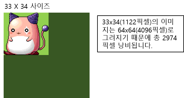 - 위의 내용만 보면 일반 스프라이트를 왜 사용하는지 낙듭이 안 갈 수 도 있습니다. 왜냐하면 일반 스프라이트들의 이미지는 한 화면에 무조건 하나만 출력되기 때문입니다. 이걸 이해하기 위해서는 이미지의 처리단위를 알아야합니다. 이미지는 내부적으로 처리 될 때 POT(Power of Two) 단위, 즉 2의 제곱 단위로 처리됩니다.