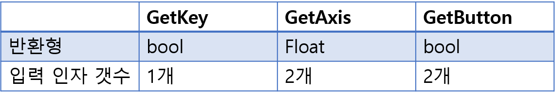 - GetButton함수는 매개변수를 GetAxis와 같은 방식으로 넘겨줍니다. 다만 GetAxis와 한가지 다른점은 GetAxis는 주로 방향에 대해서 정의 되고, GetButton은 설정해둔 단축키중 하나라도 눌렀을 경우 true를 반환합니다. 때문에 공격 액션 등에 사용됩니다.