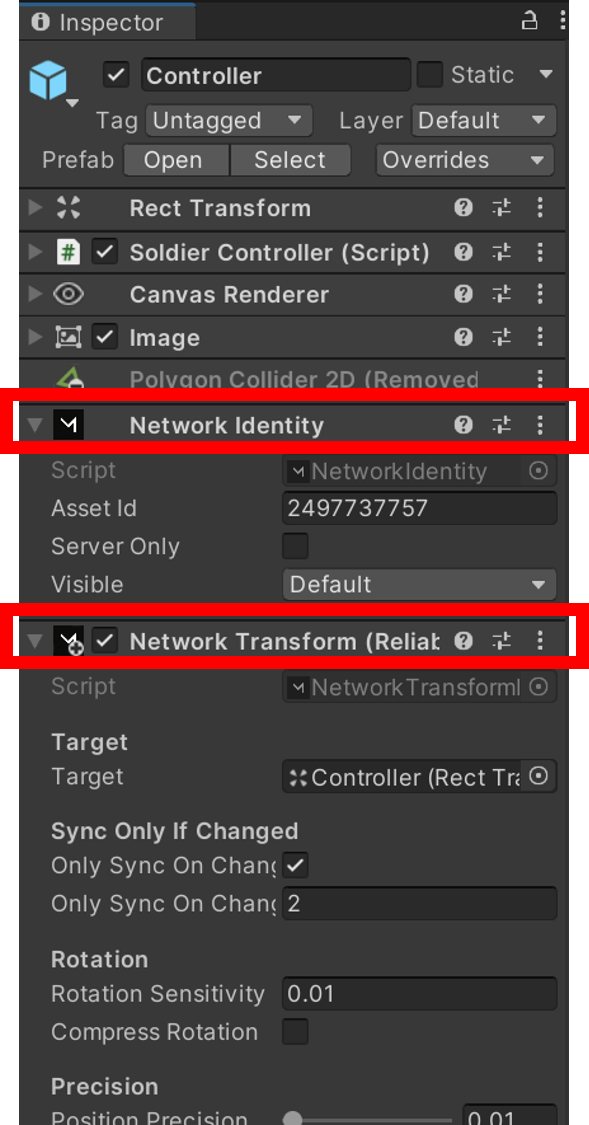 이번에는 클라이언트 역할을 해줄 오브젝트를 만들어 주겠습니다. 사각형 오브젝트를 만들어준 후 간단한 이동 script를 추가해주었습니다. 이제 이곳에 통신에 필요한 Network Identity, Network Transform 컴포넌트를 추가해줍니다. Network Identity는 서버에서 클라이언트를 분별할 수 있도록 도와주는 컴포넌트입니다. Network Transform은 멀티 플레이어들 끼리 오브젝트의 위치를 공유하고 싶을 때 사용됩니다. 해당 컴포넌트를 가지고 있는 오브젝트는 자동으로 다른 클라이언트들에게 위치를 업데이트해줍니다.