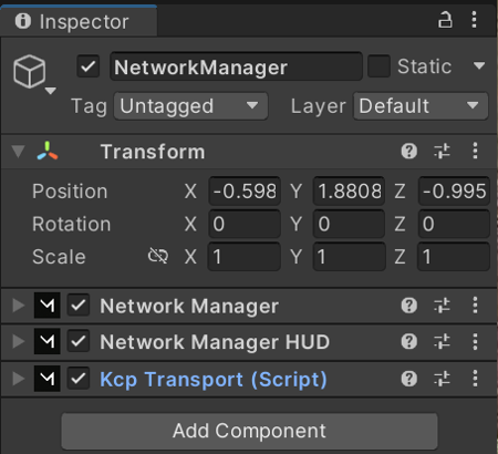 이제 기본적인 패키지 세팅은 끝났습니다. 이제 서버역할을 해줄 NetworkManager를 세팅할 차례입니다. 우선 빈 게임오브젝트를 생성해준 후 NetworkManager, NetworkManager HUD, Kcp Transport를 추가하여 줍니다. Mirror에서는 Multiplex, Simple Web, Telepathy등의 여러 transport를 제공하지만 이번 포스팅에서는 Kcp Transport만 사용하겠습니다.