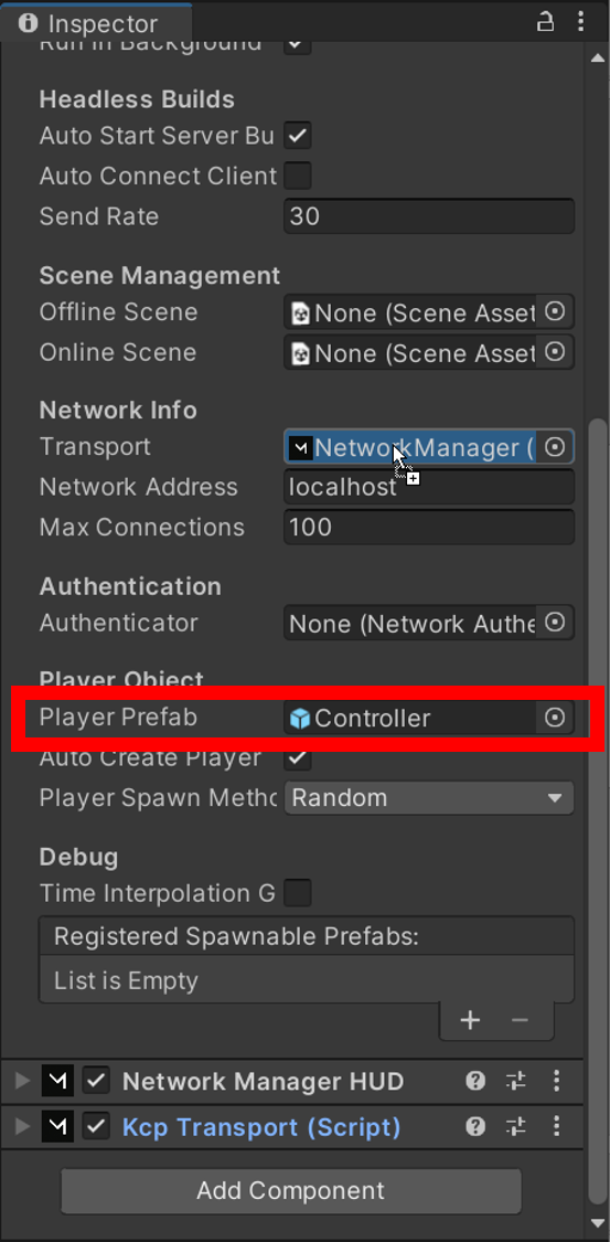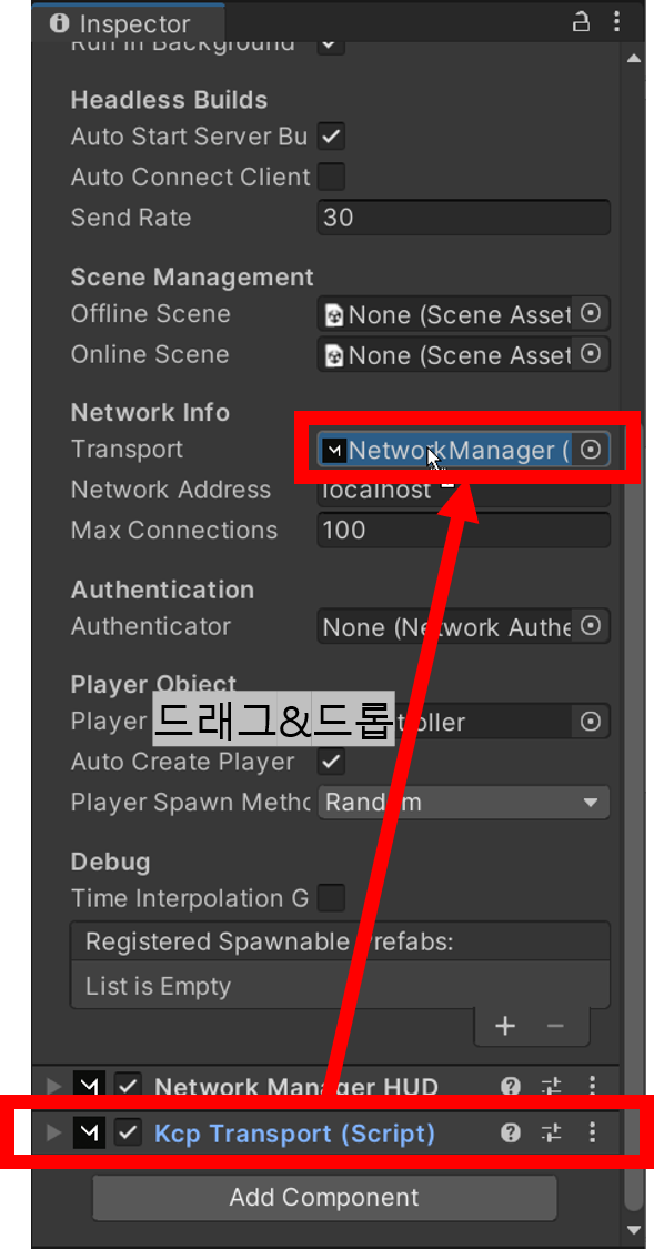 컴포넌트 추가해준 후 사용할 transport를 꼭 NetworkManager안에 있는 Transport 프로퍼티에 추가해 주어야합니다.