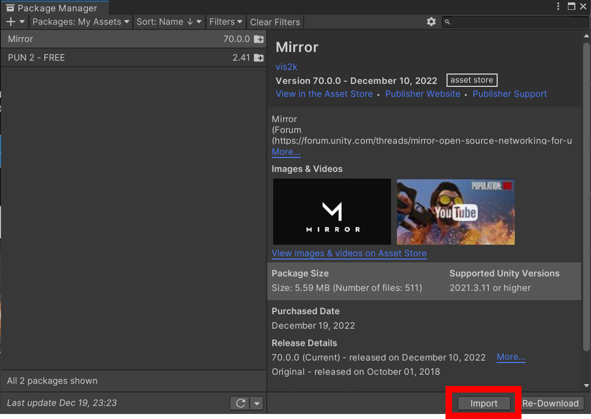 에셋스토어에서 다운로드를 끝낸후에는 프로젝트에서 Package Manager에 들어가서 Mirror를 Import해줍니다. 정상적으로 Import가 되었다면 Assets폴더안에 Mirror폴더와 ScriptTemplates폴더가 생성되었을겁니다.