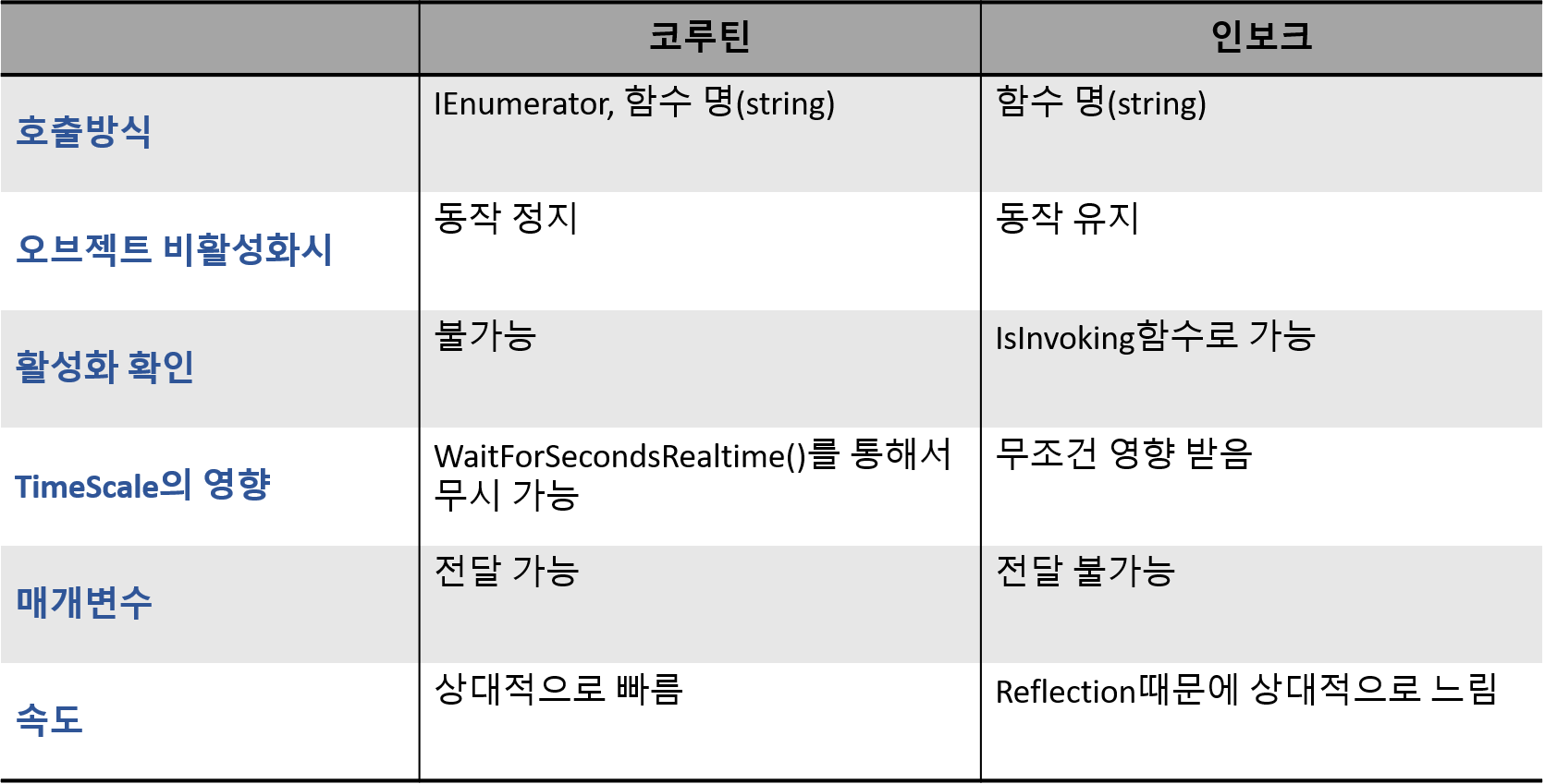 GameObject가 active상태일 때에만 작동하며 Time.scale의 영향을 받을지 말지 결정 가능합니다. 오브젝트를 비활성봐할 시 코루틴이 종료되고, 재활성화시에도 코루틴은 재실행되지 않습니다.
