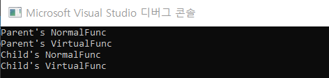 이번에는 Child함수를 Parent함수로 업캐스팅후의 실행하였습니다. 앞선 결과와는 달리 하나의 객체에서 두 가지 클래스의 함수가 실행되었습니다.