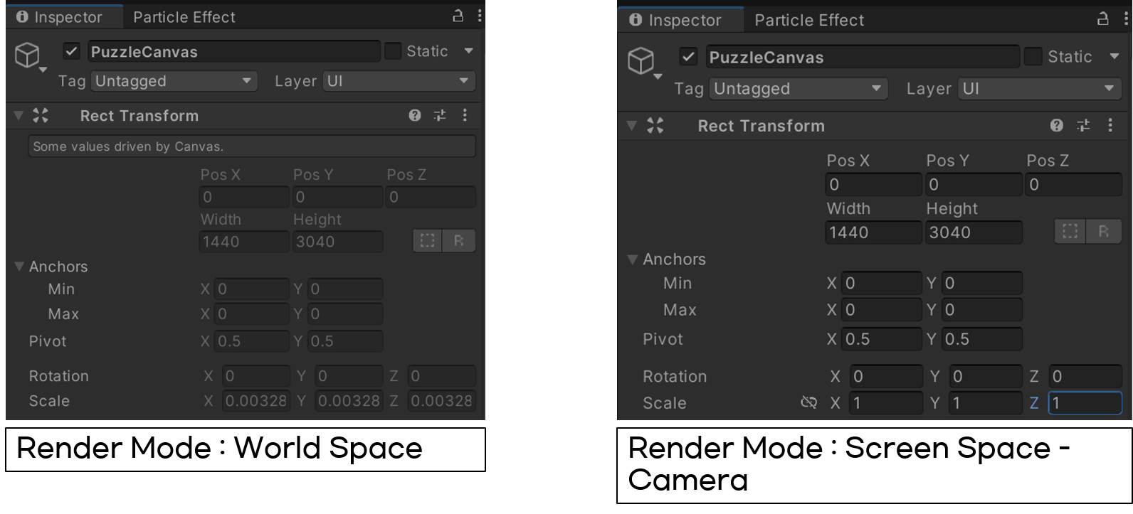 간단한 퍼즐게임을 만들던 도중에 Canvas의 렌더 모드를 변경하게 되었는데 그 이후로부터 퍼즐의 크기가 말도 안되게 커졌습니다.