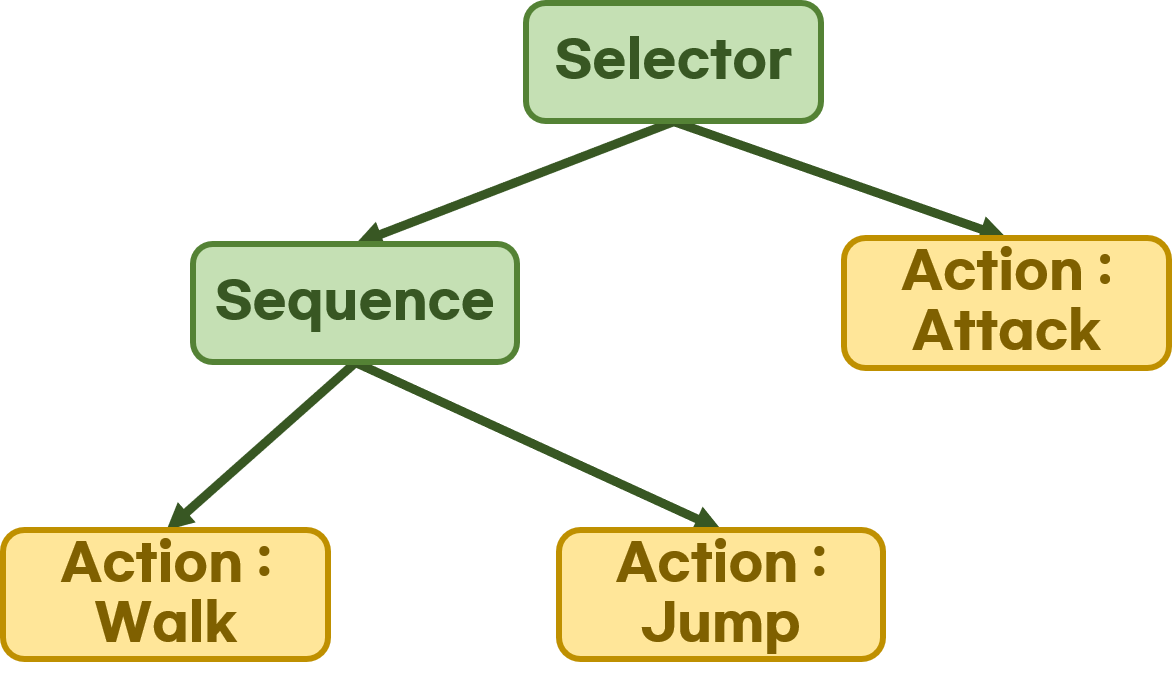 BT또한 FSM의 문제점을 보완한 방식으로 트리형태의 행동 알고리즘입니다. 모든 하위 노드의 행동 여부는 상위 노드에서 결정이 됩니다. 시각적으로 표현하기가 좀 더 용이할 뿐만 아니라 노드를 추가, 삭제, 수정을 할 때도 FSM는 해당 노드와 연결된 모든 노드들의 코드를 수정해주어야하는 반면에 BT는 간편하게 해당 노드만 고쳐주면 되어서 유지보수에 용이합니다.