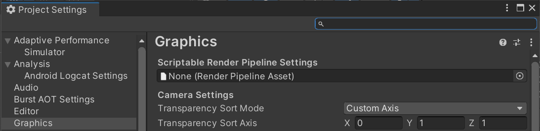 이러한 문제를 해결하기 위해서 유니티는 Custom Axis라는 기능을 제공합니다. Custom Axis는 기존의 Z값 단계에서 X값 또는 Y값을 추가하여 렌더링 순서를 결정할 수 있게 해줍니다. 이때 Sorting Order는 (X Axis * x) + (Y Axis * y) + (Z Axis * z)값을 기준으로 결정됩니다.