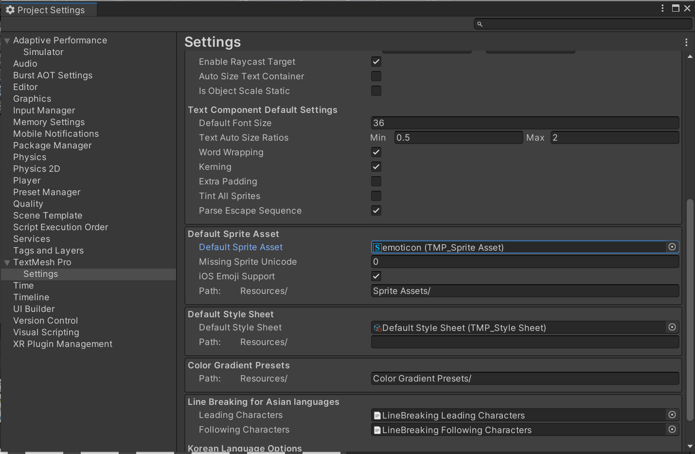 이제 생성한 이모지 파일을 사용하겠다고 설정을 해주어야합니다. Project Settings -> TextMeshPro -> Settings -> Default Sprite Asset에서 Default Sprite Asset을 방금 만든 이모지 파일로 교체하여 줍니다.