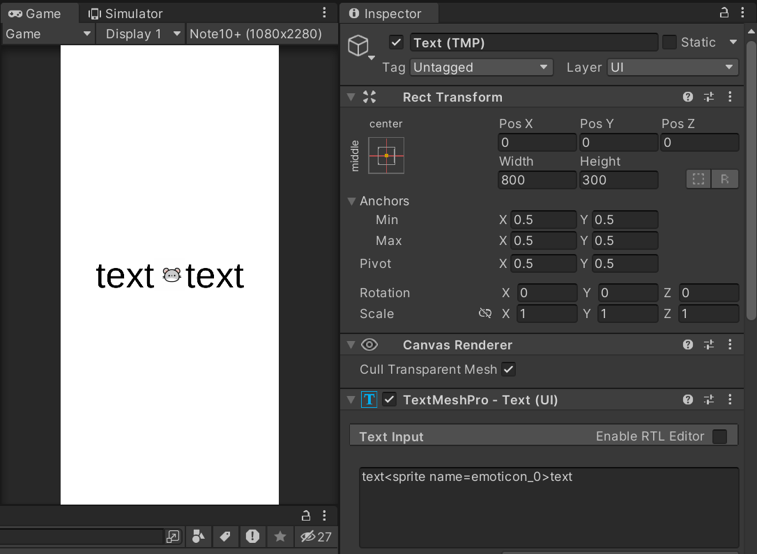 이제 이모지 사용을 위한 세팅은 끝났습니다. TextMeshPro에서 <sprite name=이모지 네임>을 입력하여주면 해당 이모지가 출력되는 것을 볼 수 있습니다.