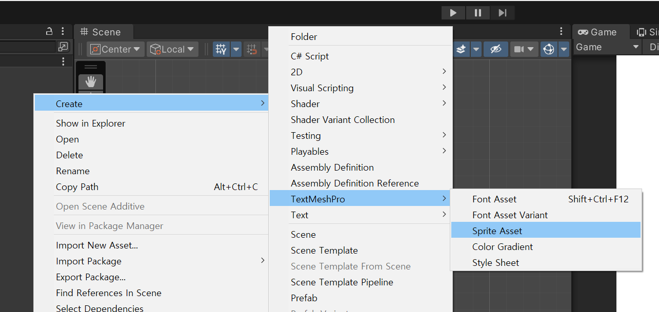 이 다음엔 잘라낸 이미지 스프라이트를 이모지 파일로 변환하여 주어야하는데 이 기능도 TMP에서 제공해줍니다. 해당 이미지 파일을 우 클릭하고 Create -> TextMeshPro -> Sprite Asset을 눌러줍니다.